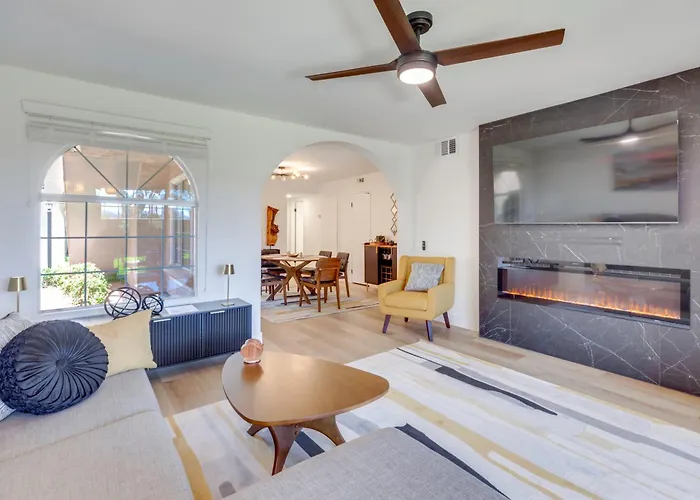 Situated nearly a 25-minute walk from the Antique Galleries of Palm Springs, the spacious Patio And Pool Access! Mtn-View Palm Springs Escape Apartment provides guests with Wi-Fi for either business or leisure. This apartment boasts a hot tub and provides access to a golf club and a golf playground in the area.